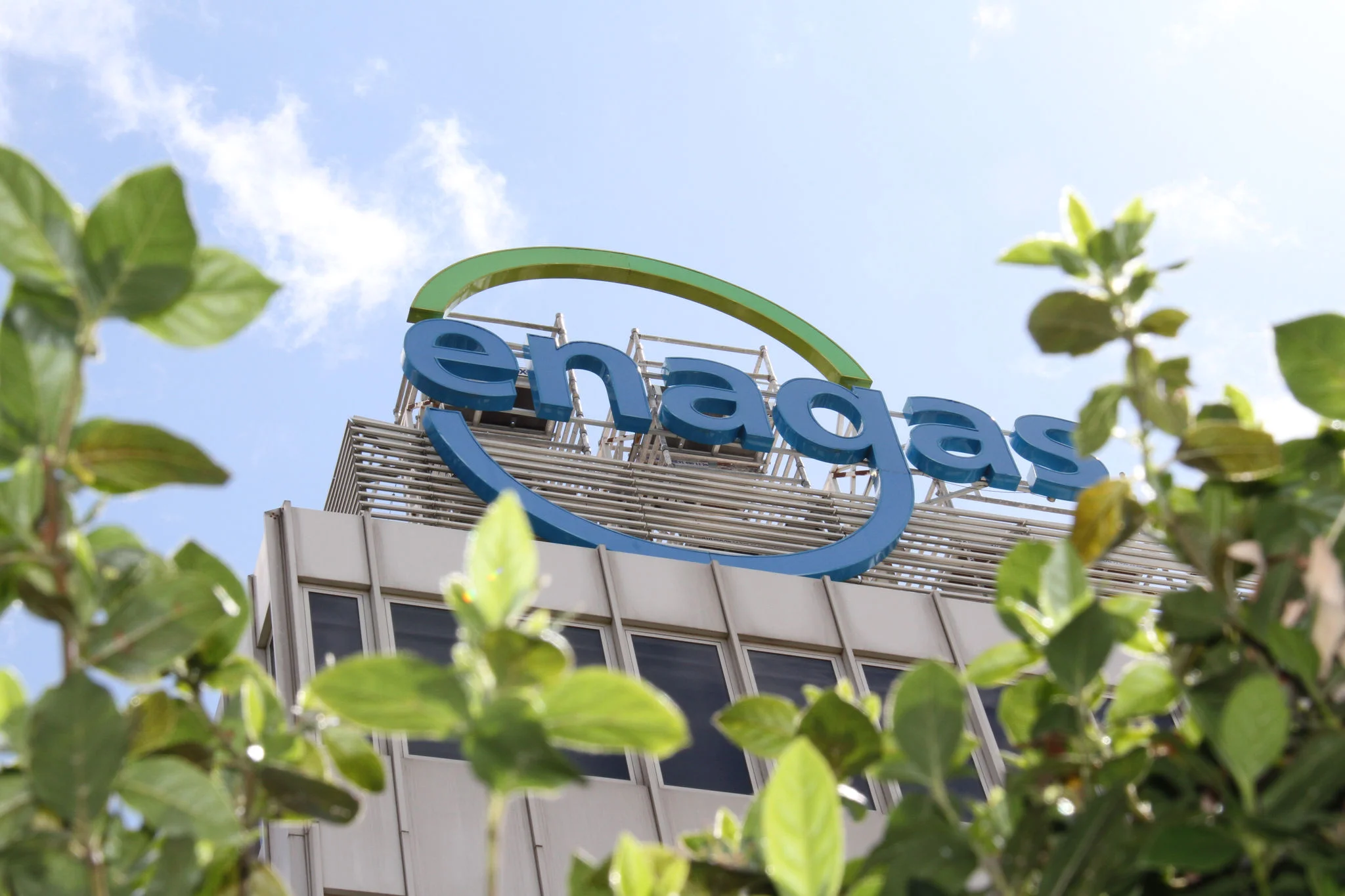 Detalle del logotipo de Enagás situado en la parte superior del edificio de la sede central en el Paseo de los Olmos